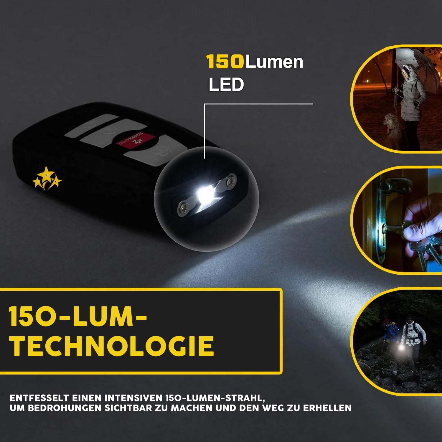 A beépített taktikai zseblámpa 150 lumenes vakító fényt bocsát ki, amely elég erős ahhoz, hogy megvilágítsa a sötét utcákat, sikátorokat, parkolókat, kempingeket, vagy akár az autója környékét is, mielőtt beszállna. Ez a tökéletes eszköz a mindennapi használatra, amely biztosítja az éjszakai biztonságát, és lehetővé teszi, hogy tisztán lásson és gyorsan reagáljon – még mielőtt a veszély közeledne.
