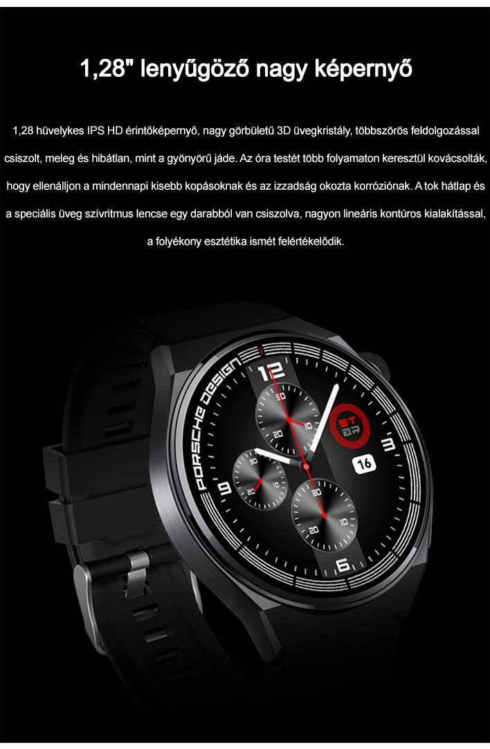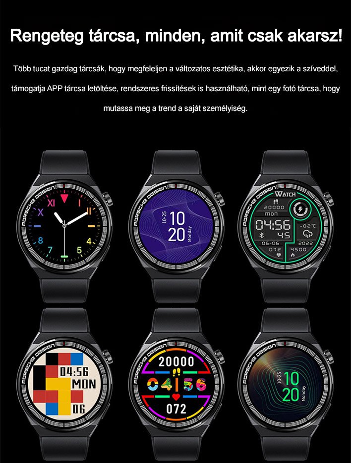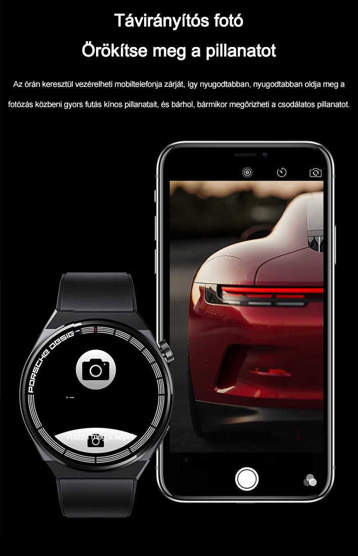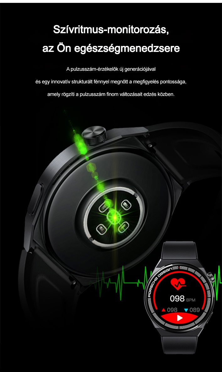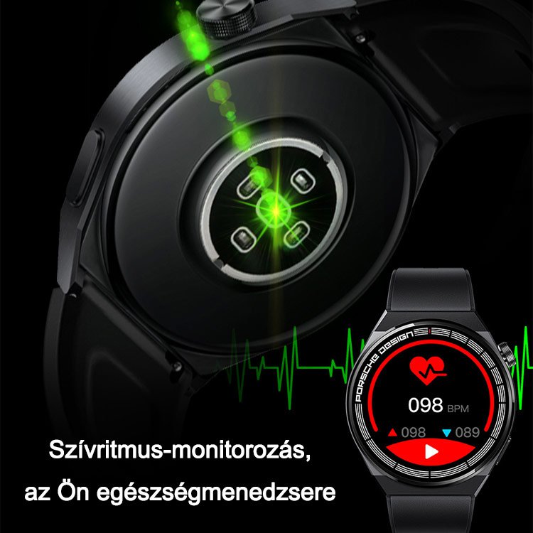 Az óra és a Porsche Smart Wear nem csak egy óra, hanem az Ön személyes komornyikja is, amely mindössze 1 másodperc alatt képes pontosan követni a vércukorszintet, a pulzusszámot, a vérnyomást, a pulzusszámot és a testhőmérsékletet. Mindig figyelje az egészségét.